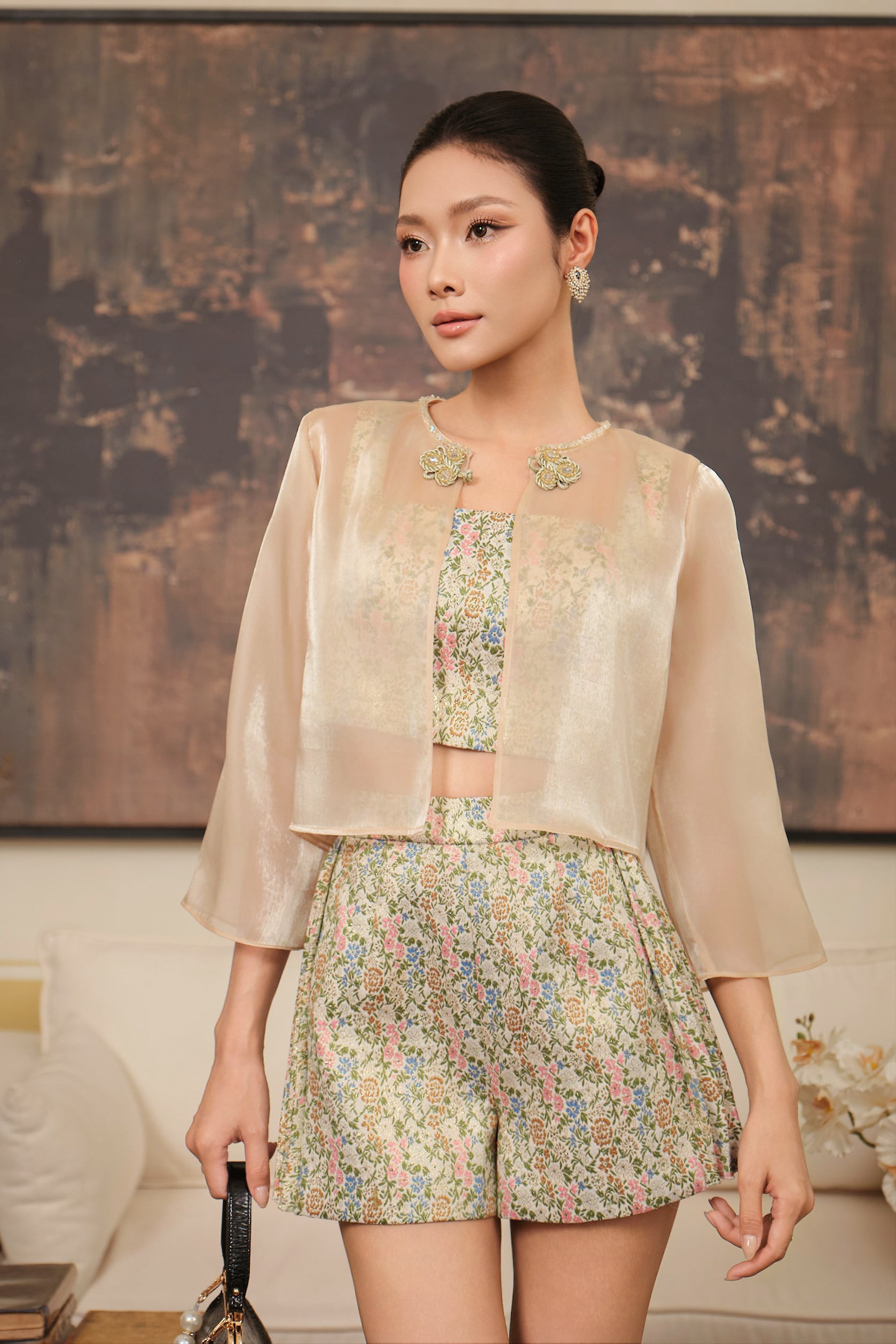 This refined two-piece set features a delicately tailored floral jacquard top and shorts, layered with a sheer outer jacket that adds fluidity and elegance to the silhouette.