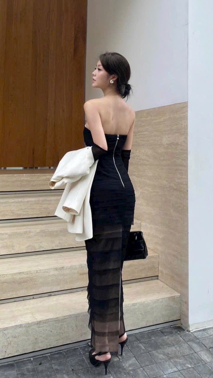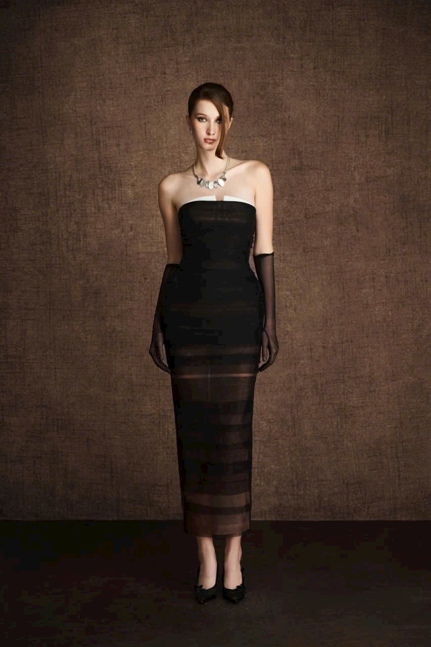 A captivating strapless dress defined by delicate pleated details and a graceful black ombré that transitions softly across the entire silhouette. The structured bust design serves as a striking focal point, enhancing both elegance and allure. Fabric & Craftsmanship • Outer layer of soft pleated tulle, hand-dyed to achieve subtle gradient tones • Middle mesh layer providing shaping and structure • Inner premium silk lining for a smooth, skin-friendly feel • Tulle fabric composed of high-quality cotton and polyester, offering a lightweight, sheer, and alluring finish Highlights • Strapless silhouette with structured bust • Hand-dyed black ombré pleats for depth and sophistication • Three-layer construction for elegance and comfort • Lightweight tulle with timeless femininity