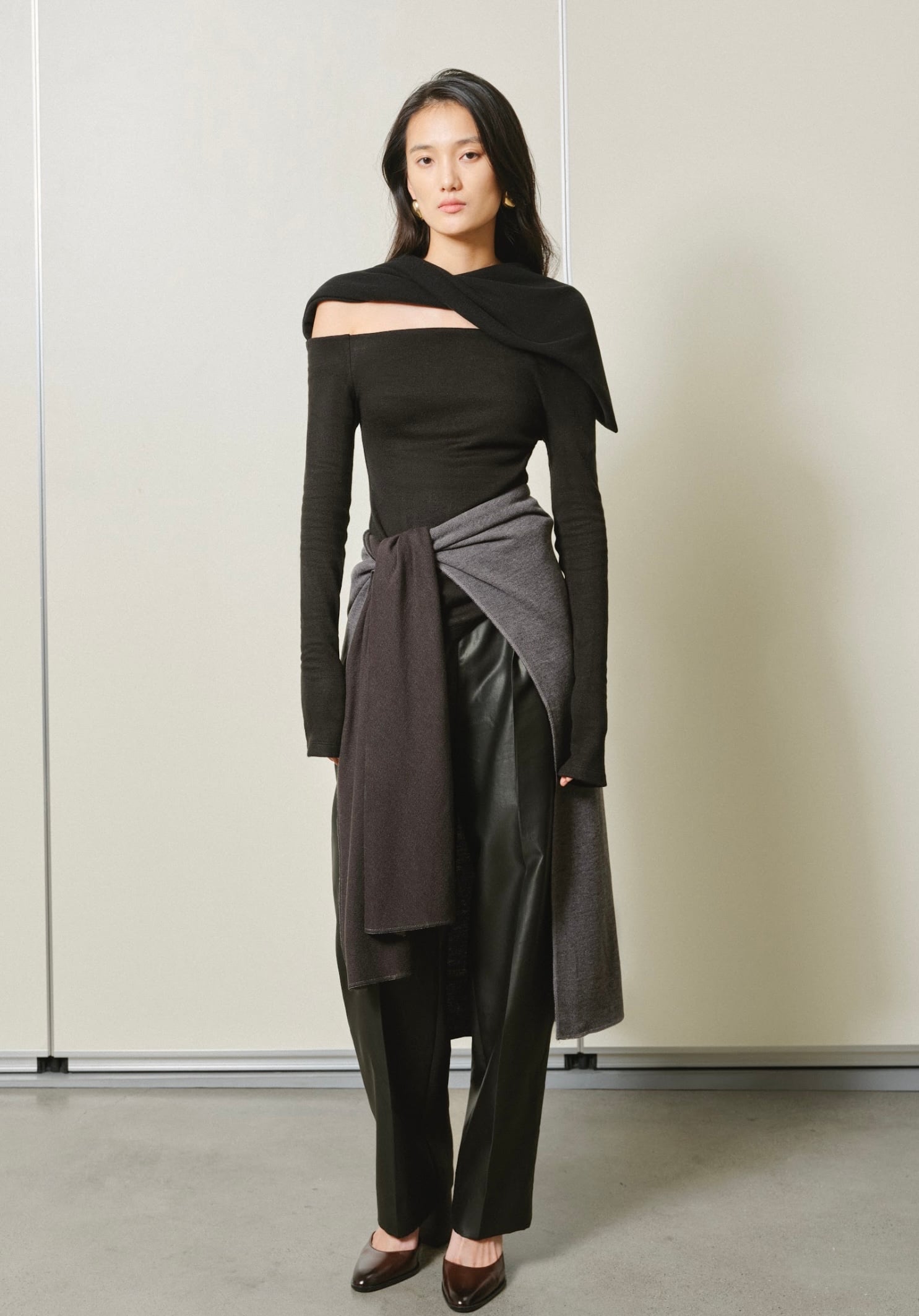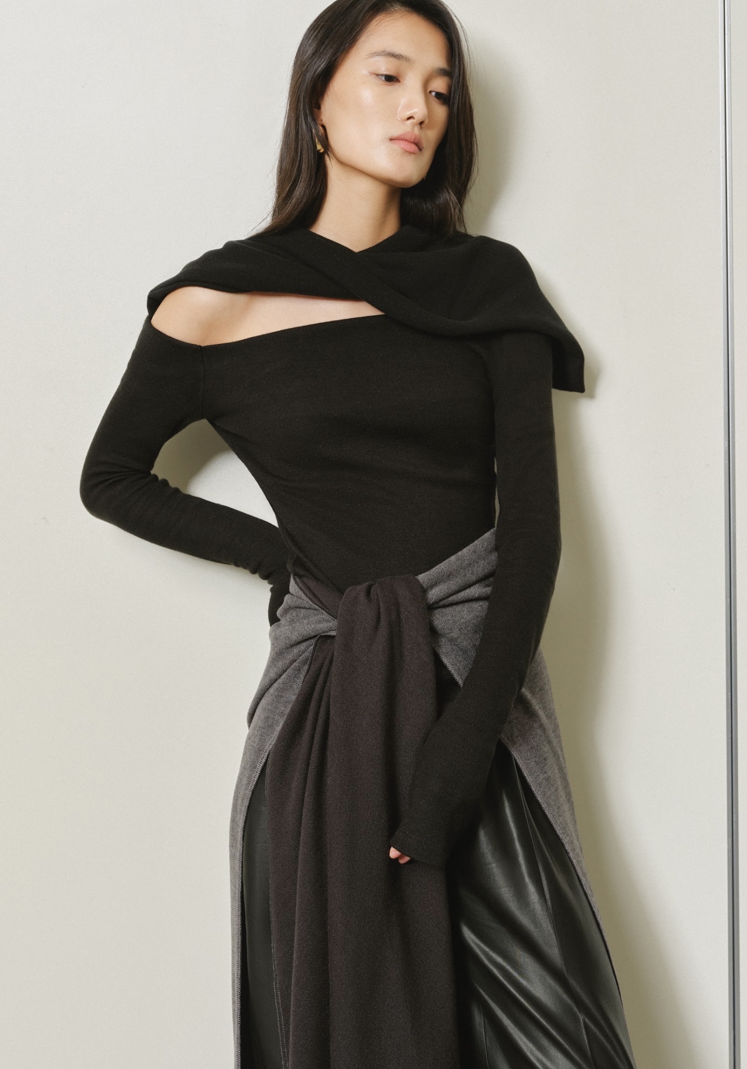 A dramatic, fitted knit top in black, featuring a sleek long sleeve and a unique neckline with a cowl drape combined with a subtle shoulder cut-out detail. Material: Double Jersey Size: Bust: S: 64 / M: 68 / L: 72 Top length: S: 56 / M: 57 / L: 59