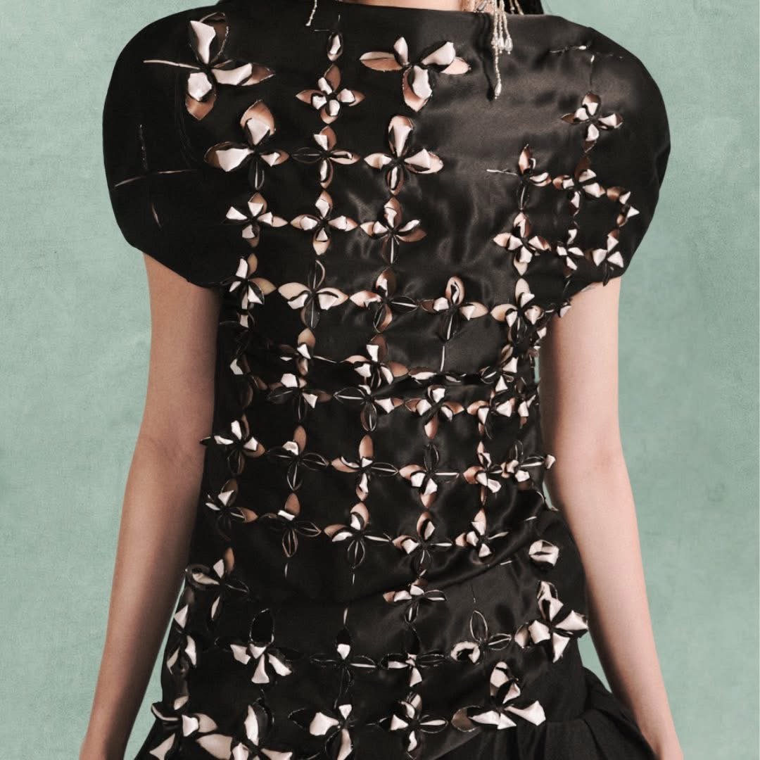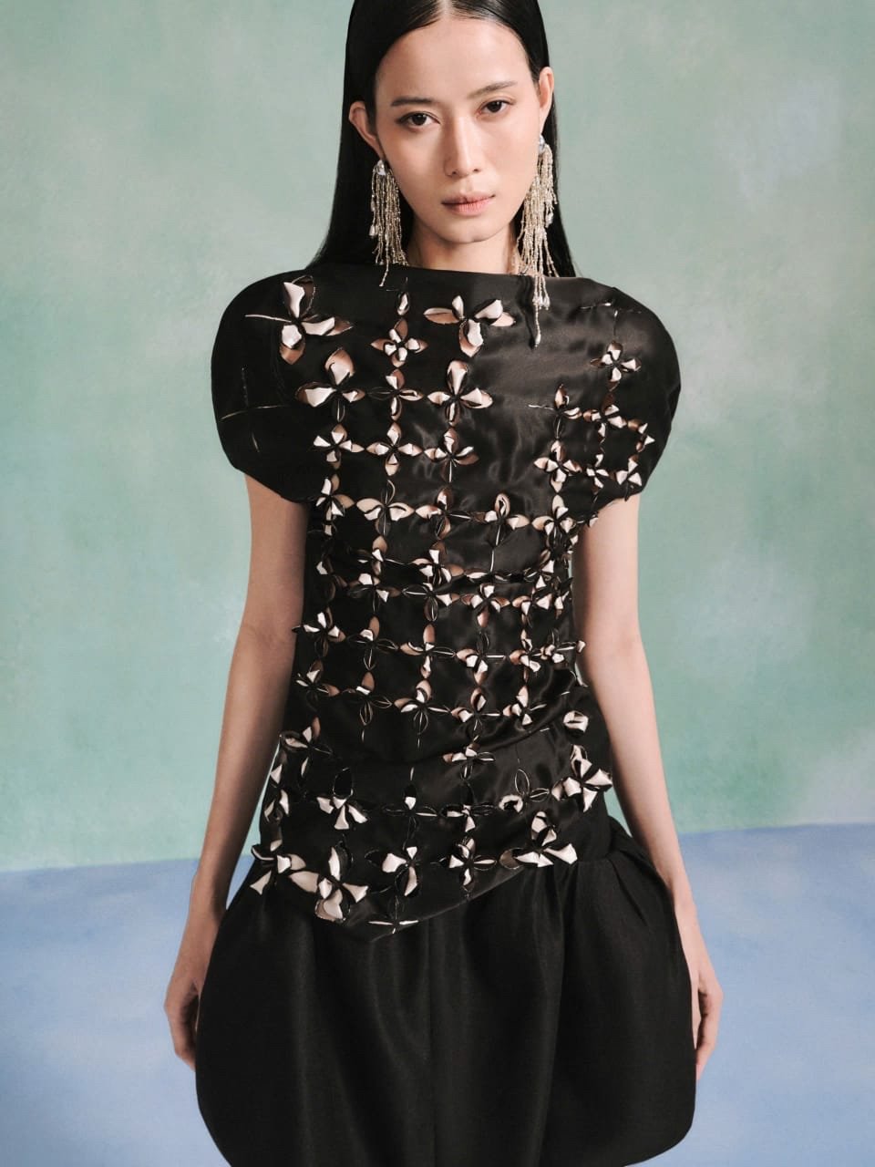 • Sleek black fitted tee crafted from luxurious double-face satin. • Features intricate 3D florals created through signature laser-cut craftsmanship. • Blends modern edge with a romantic, elegant finish—perfect for both statement styling and refined layering. Material: Double-Face Satin Care: Dry Clean Only | Steam Iron Only
