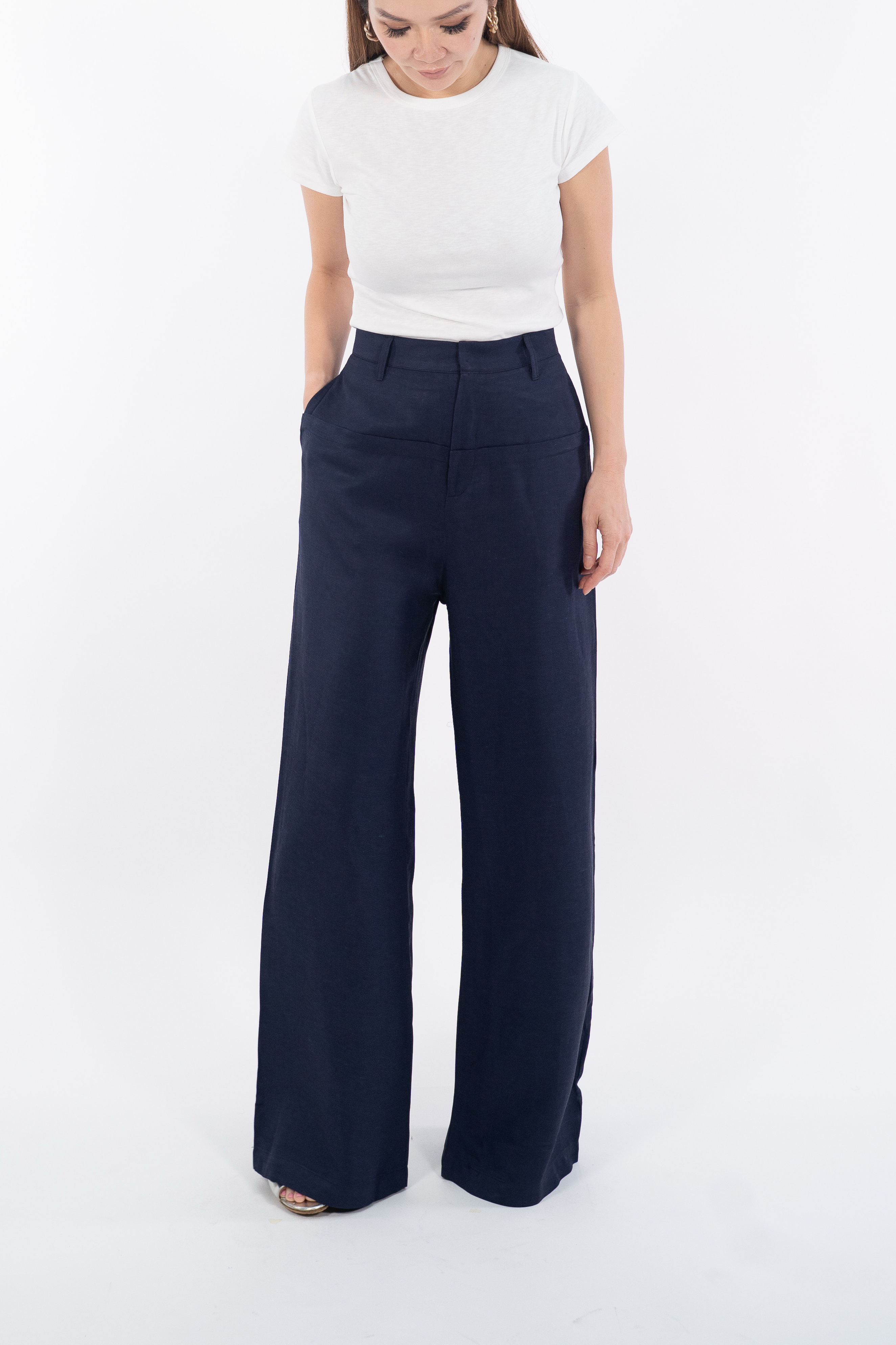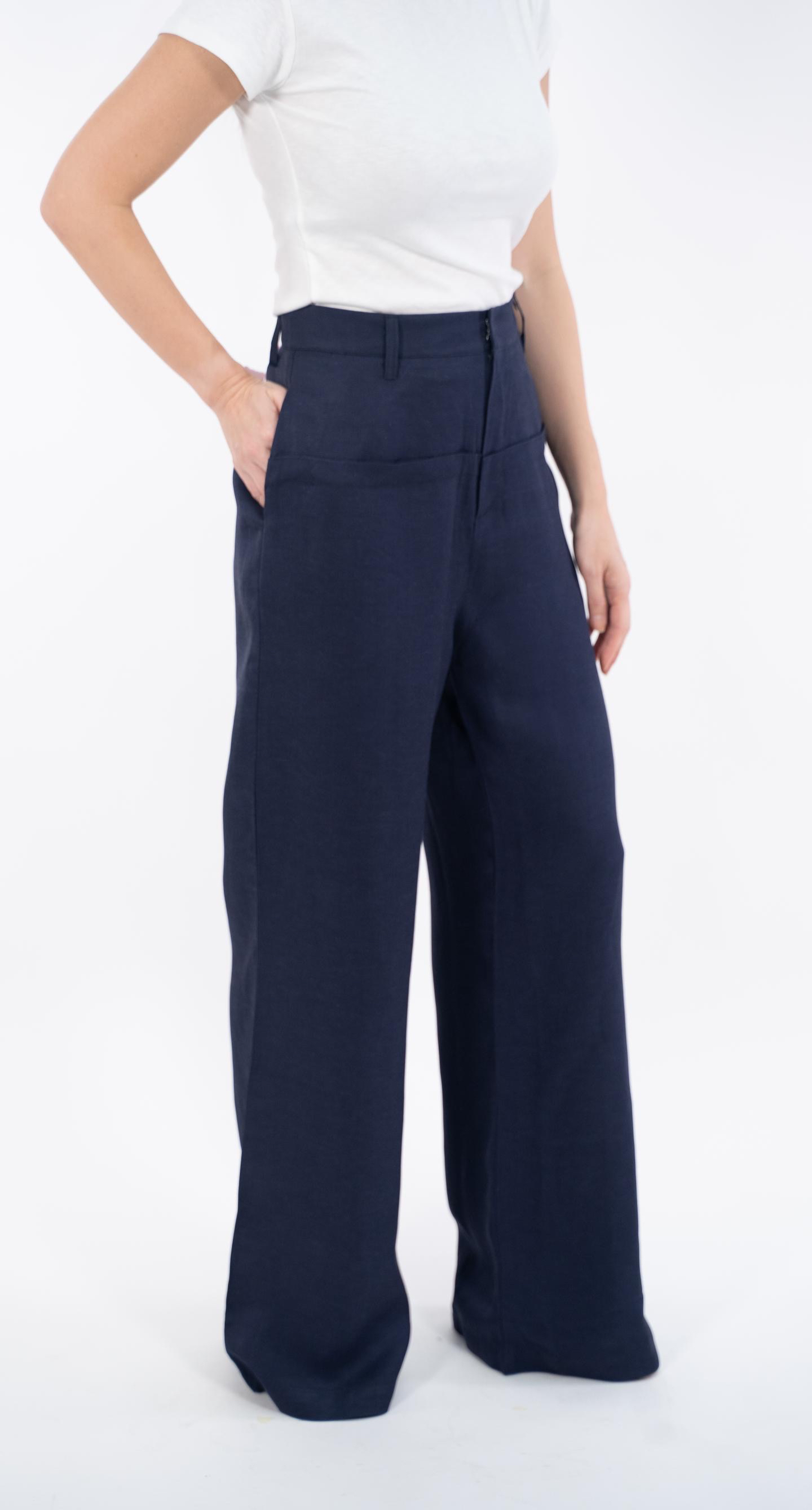 A timeless wardrobe essential crafted from breathable linen in a deep navy hue. Designed with a flattering high waist and a relaxed wide-leg silhouette, these trousers offer effortless comfort and polish for everyday wear. Finished with functional side pockets and a smooth front panel for a refined look. Fabric & Details • Fabric: Breathable linen • Color: Dark Navy Blue • Design: High-waist, wide-leg • Details: Side pockets, belt loops, smooth front panel • Ideal for: Work, weekend styling, travel * Fits slightly oversized; kindly refer to the size chart.