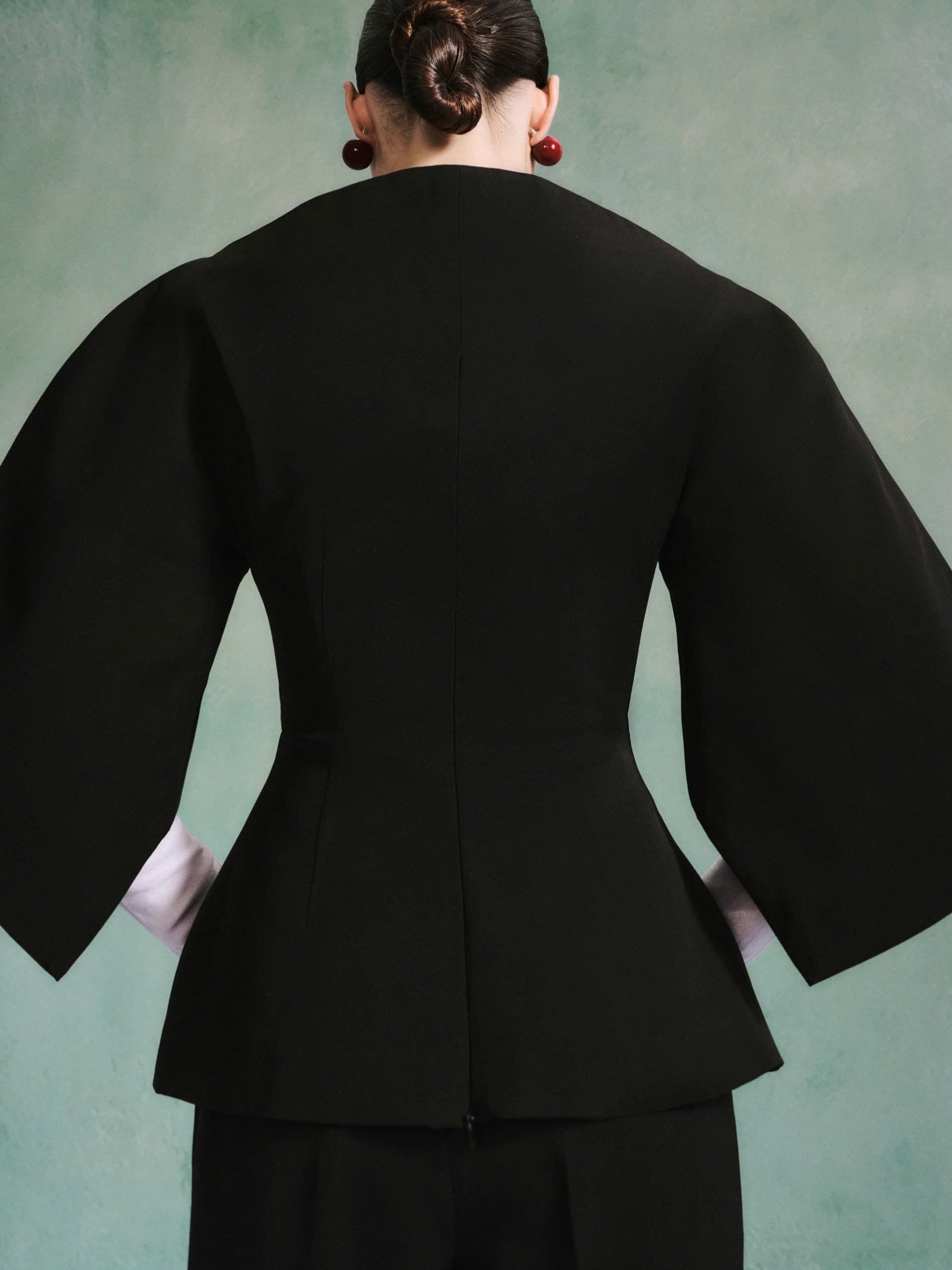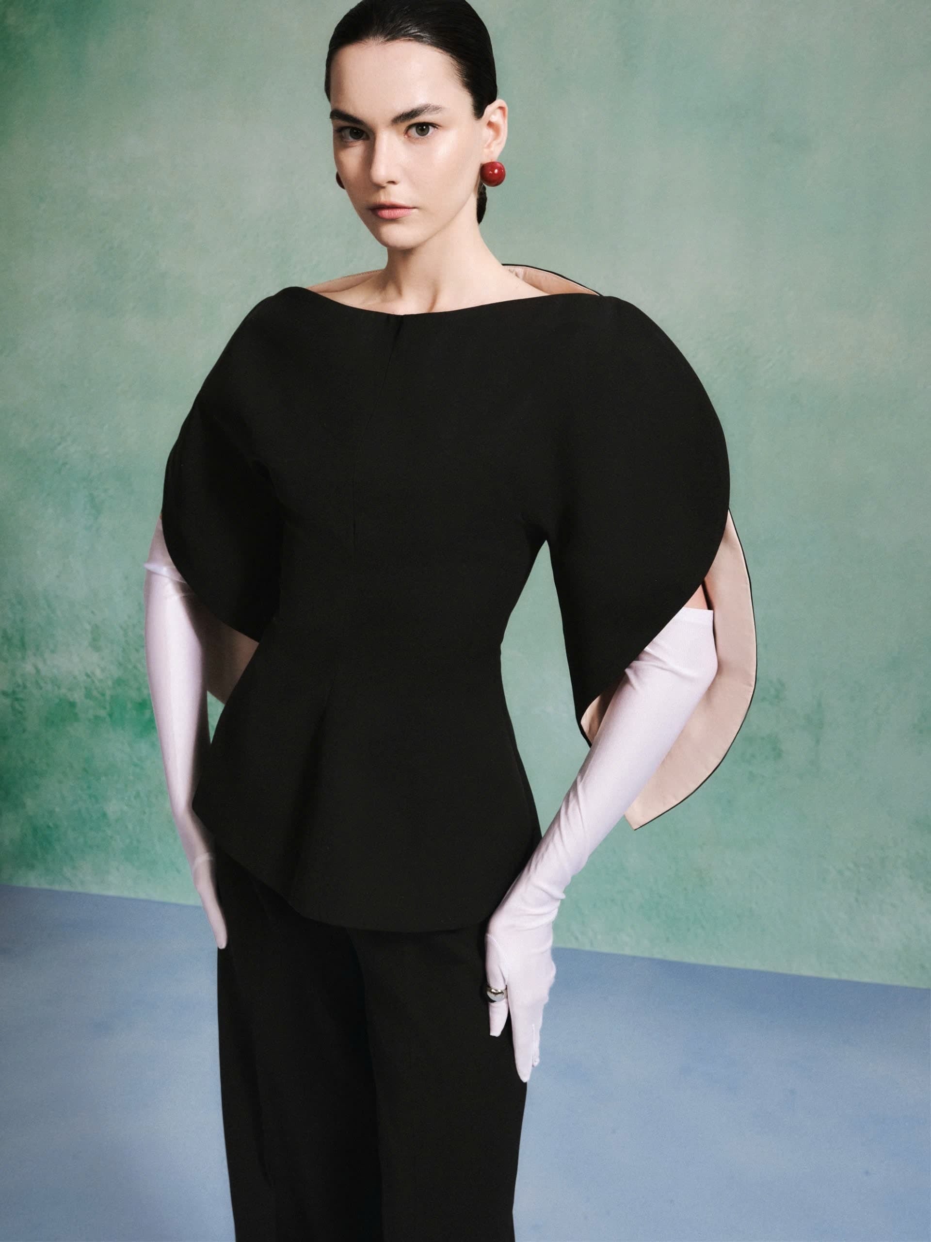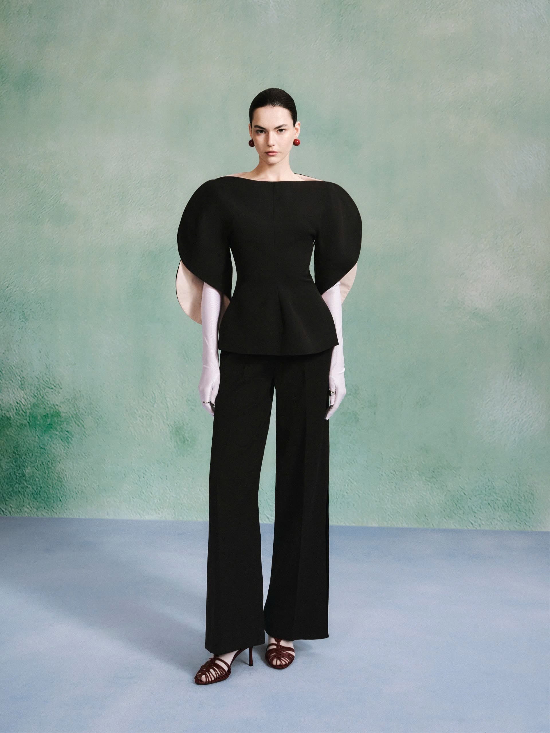 A statement black top featuring sculptural, calla-lily–inspired sleeves that create an elegant, couture silhouette. Crafted from premium bistretch crepe, this design offers a smooth, structured fit while maintaining comfort and flexibility. A modern masterpiece that elevates any tailored look.