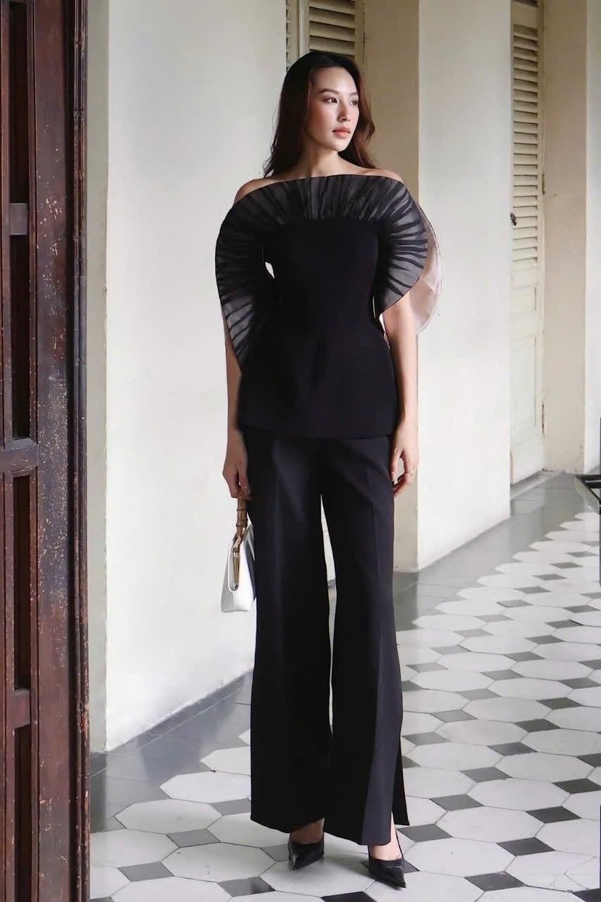 A sculpted black bodice adorned with delicate fan-petal tulle, crafted in Bistretch Crepe for effortless support and fluid movement.