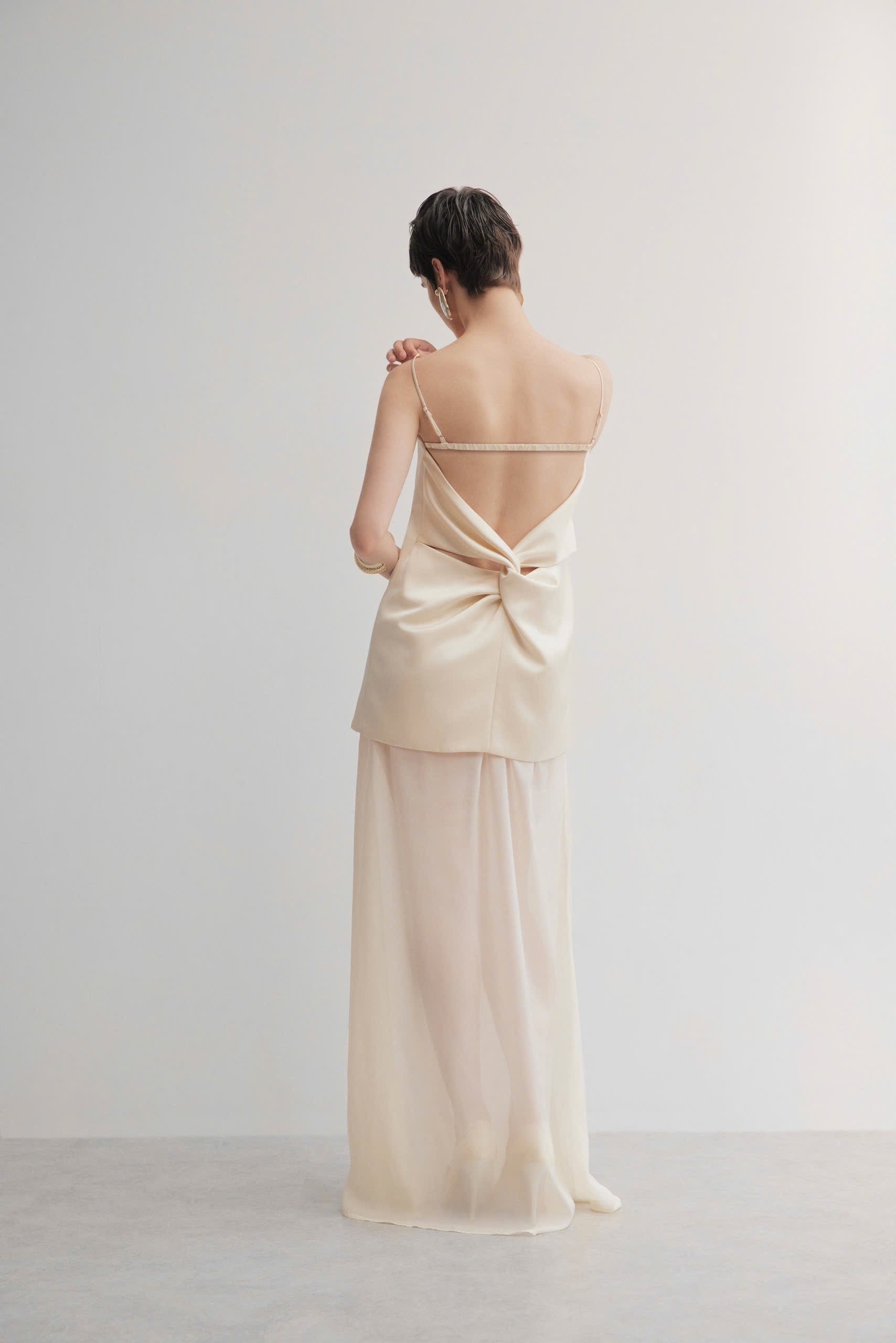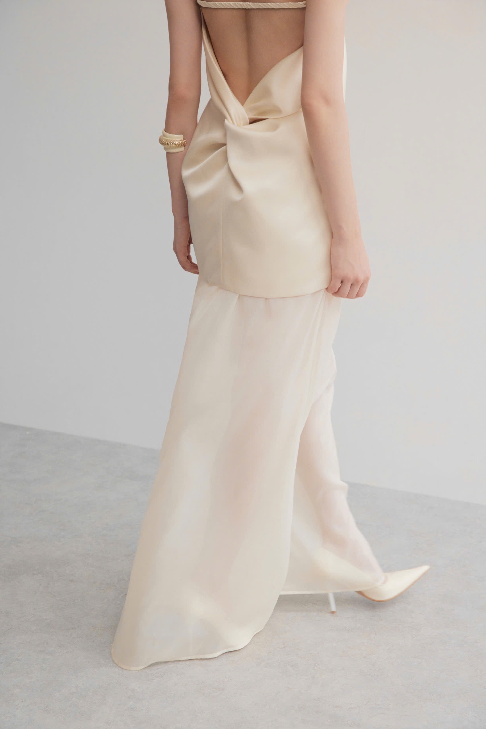 A breathtaking study in minimal elegance, this one-piece dress is crafted from a satin-silk bodice that drapes fluidly into a sheer organza column skirt. The highlight of the design is the sculptural back twist — a refined fold that reveals an open back with soft, feminine movement. Lightweight, ethereal and effortlessly refined, the gown flows beautifully with each step, creating an elongated, graceful silhouette. Perfect for modern eveningwear, events, and special occasions. Fabric • Top: Premium satin-silk blend • Skirt: Sheer silk organza Design Details • One-piece construction • Delicate spaghetti straps • Sculptural draped back twist • Sheer organza skirt with soft flow • Champagne cream tone • Modern, minimalist silhouette Fit • True to size • Relaxed satin bodice, structured twist back • Light, airy fall from waist to hem ⸻ 🧺 Wash Instructions • Hand wash cold • Do not bleach • Hang or lay flat to dry • Steam gently (avoid high heat on organza) • Dry clean recommended for best longevity