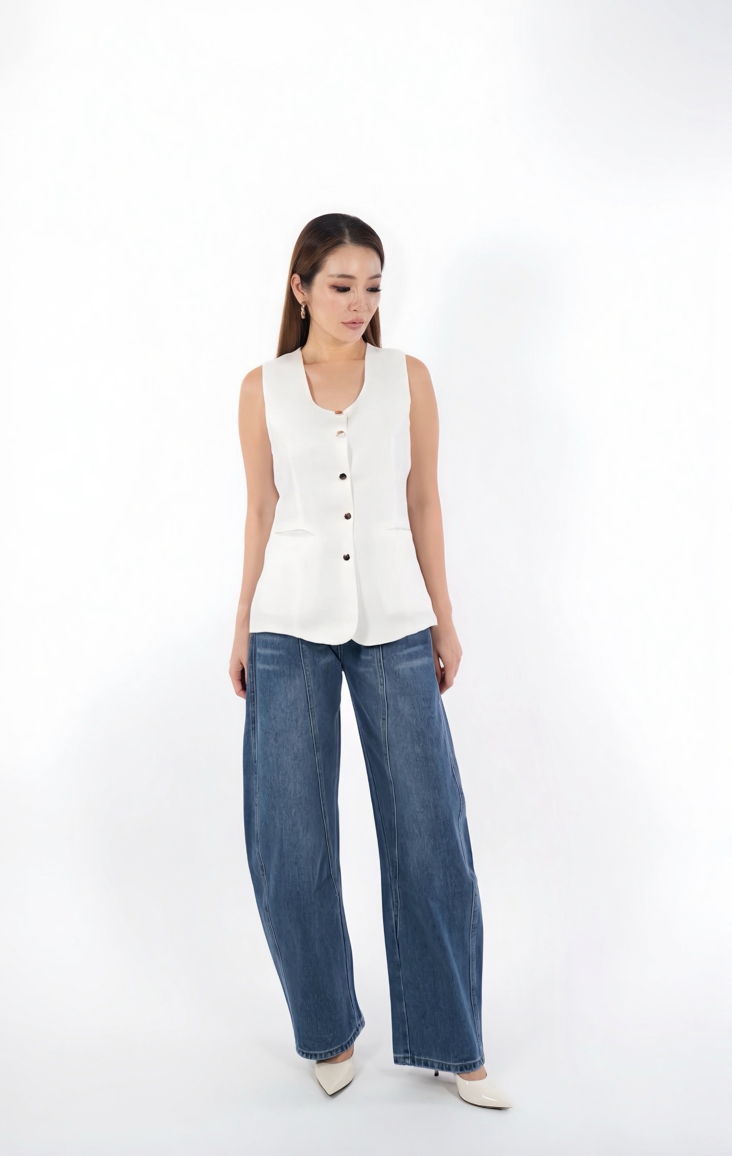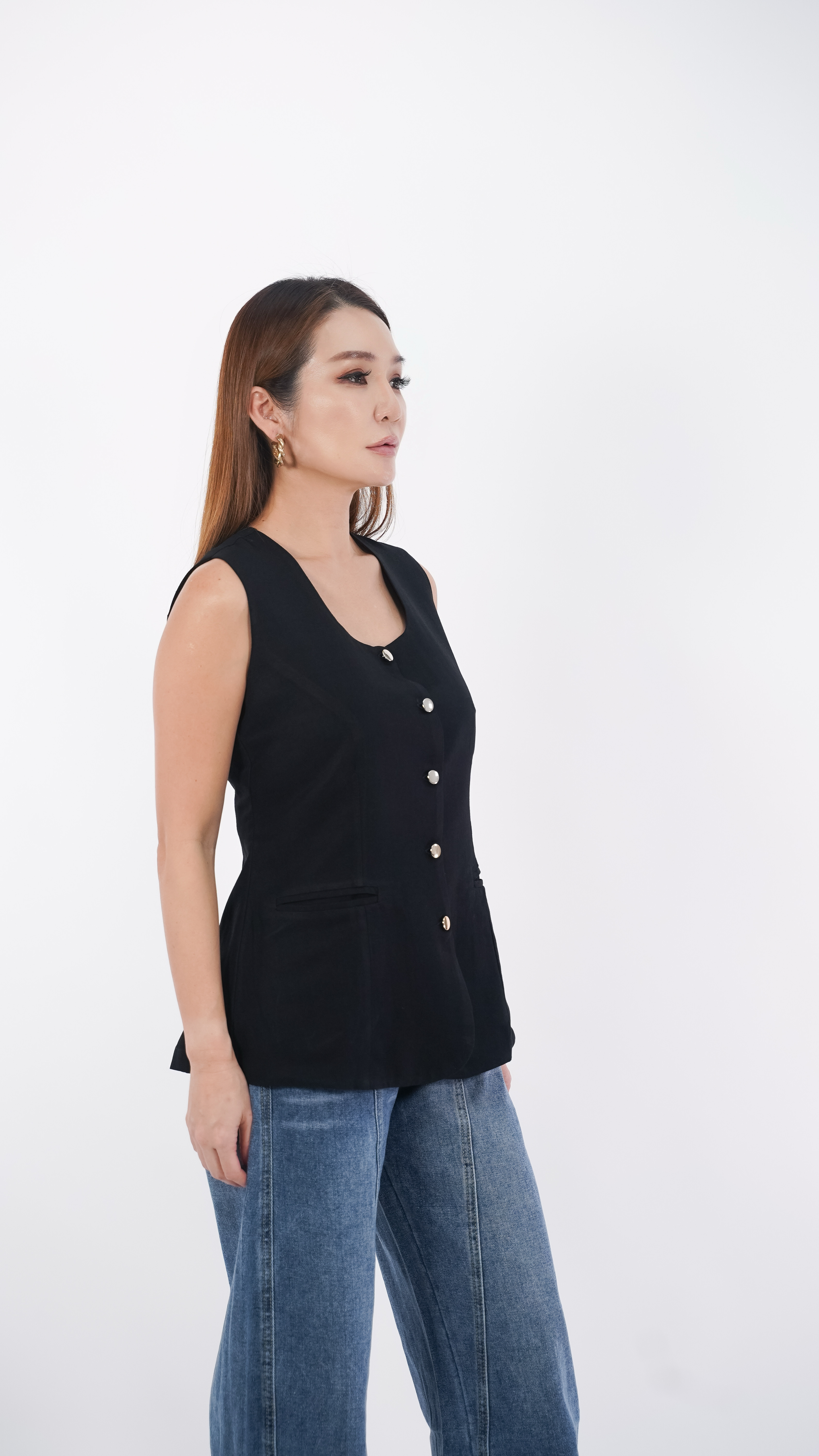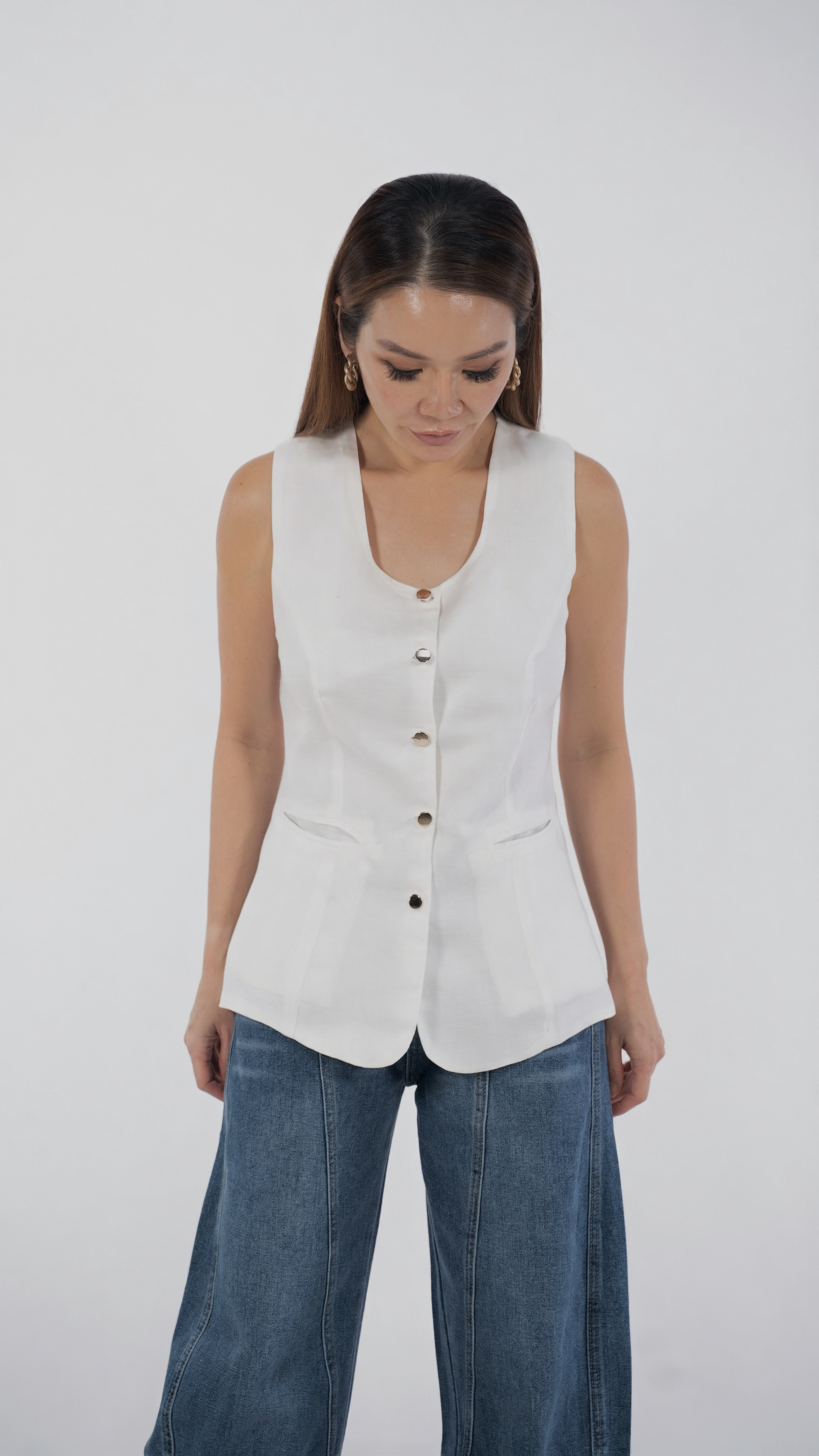 A clean, structured vest crafted from breathable linen — designed for effortless sophistication. Featuring a sculpted waist, front button closure, and subtle welt pockets, this piece shapes the body beautifully while staying lightweight and comfortable. Perfect for styling with denim, tailored trousers, or as a polished layering piece. Fabric: Linen Details: • Sculpted waistline • Front button fastening • Welt pocket detailing • Adjustable back strap (Black version)