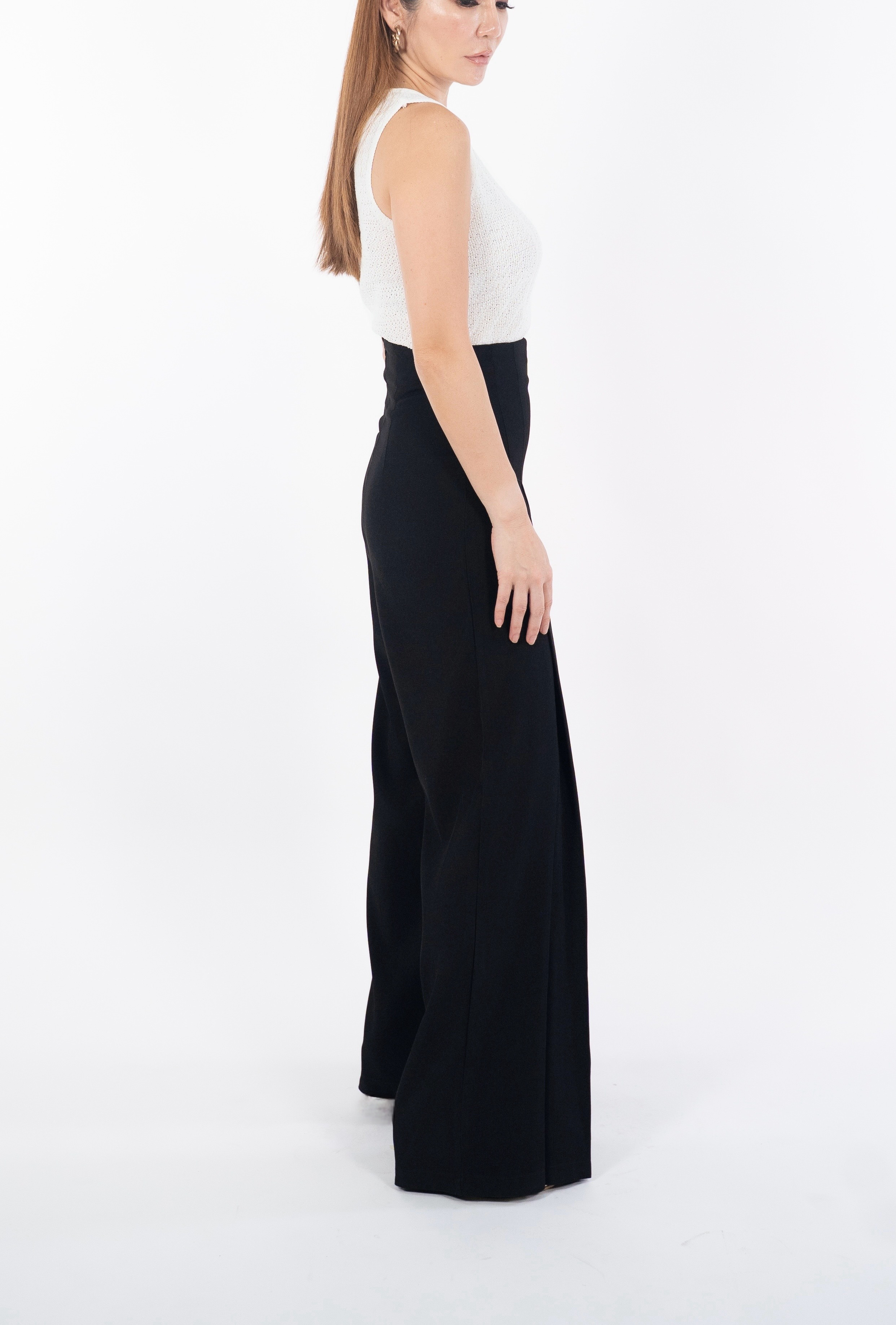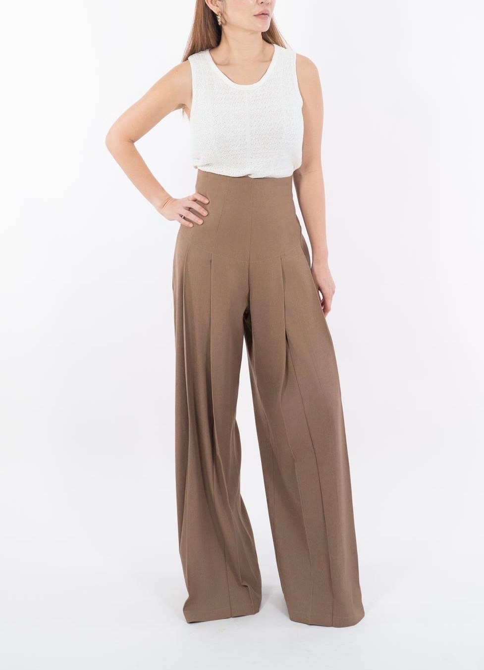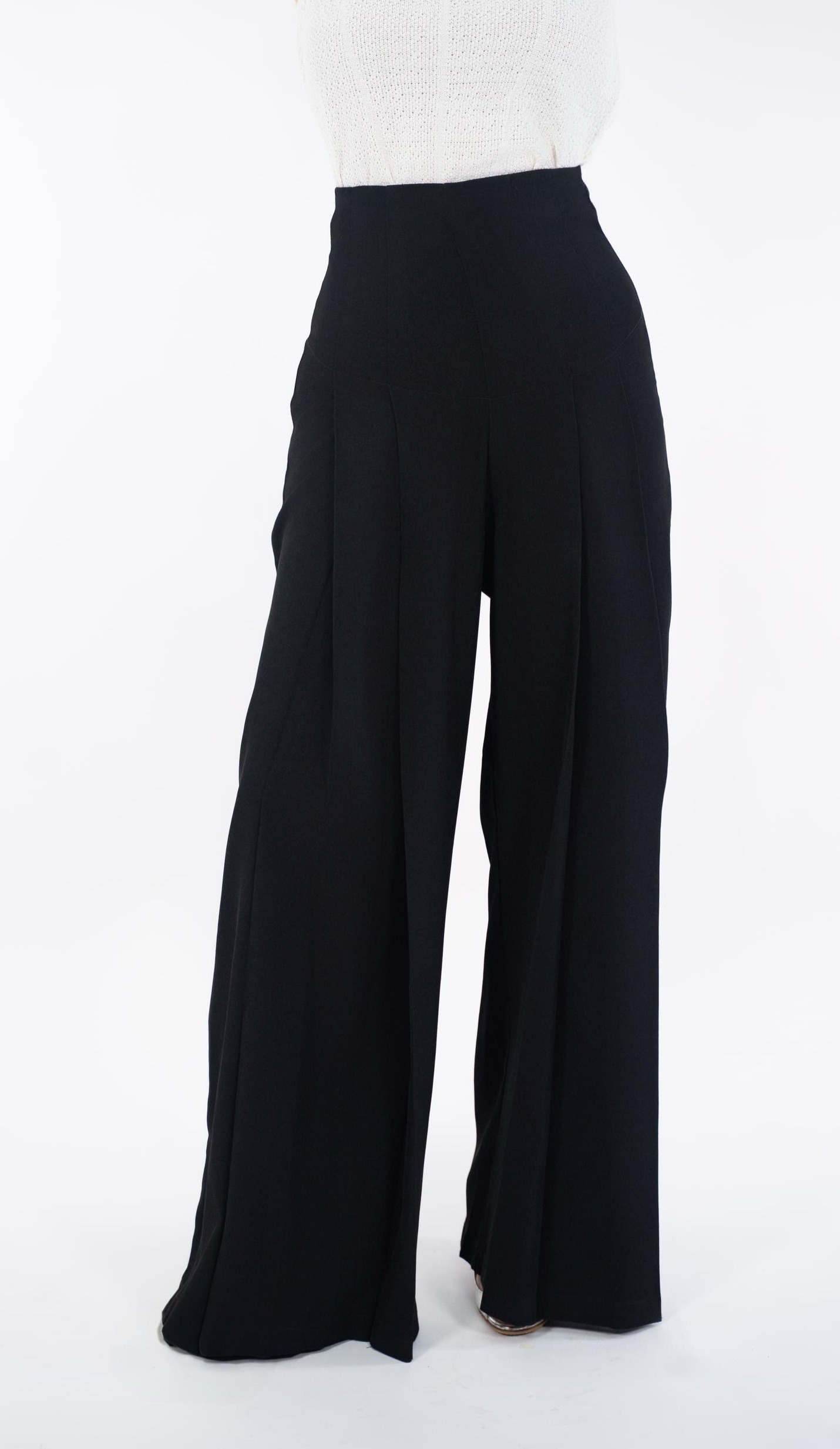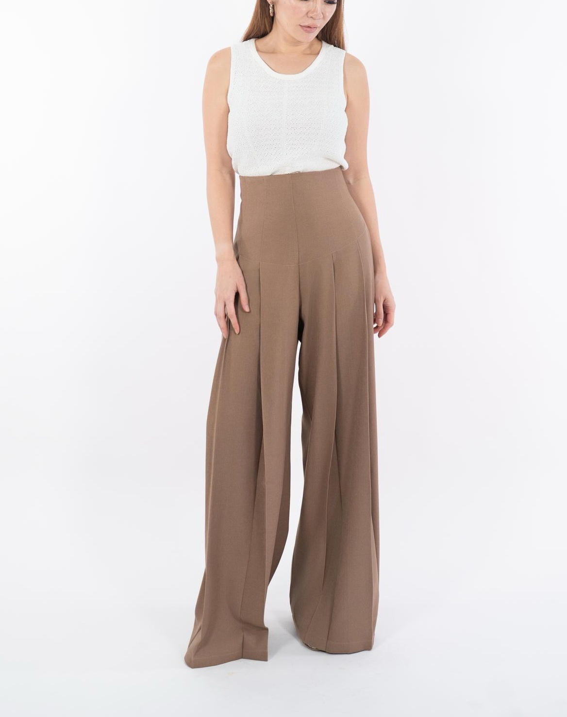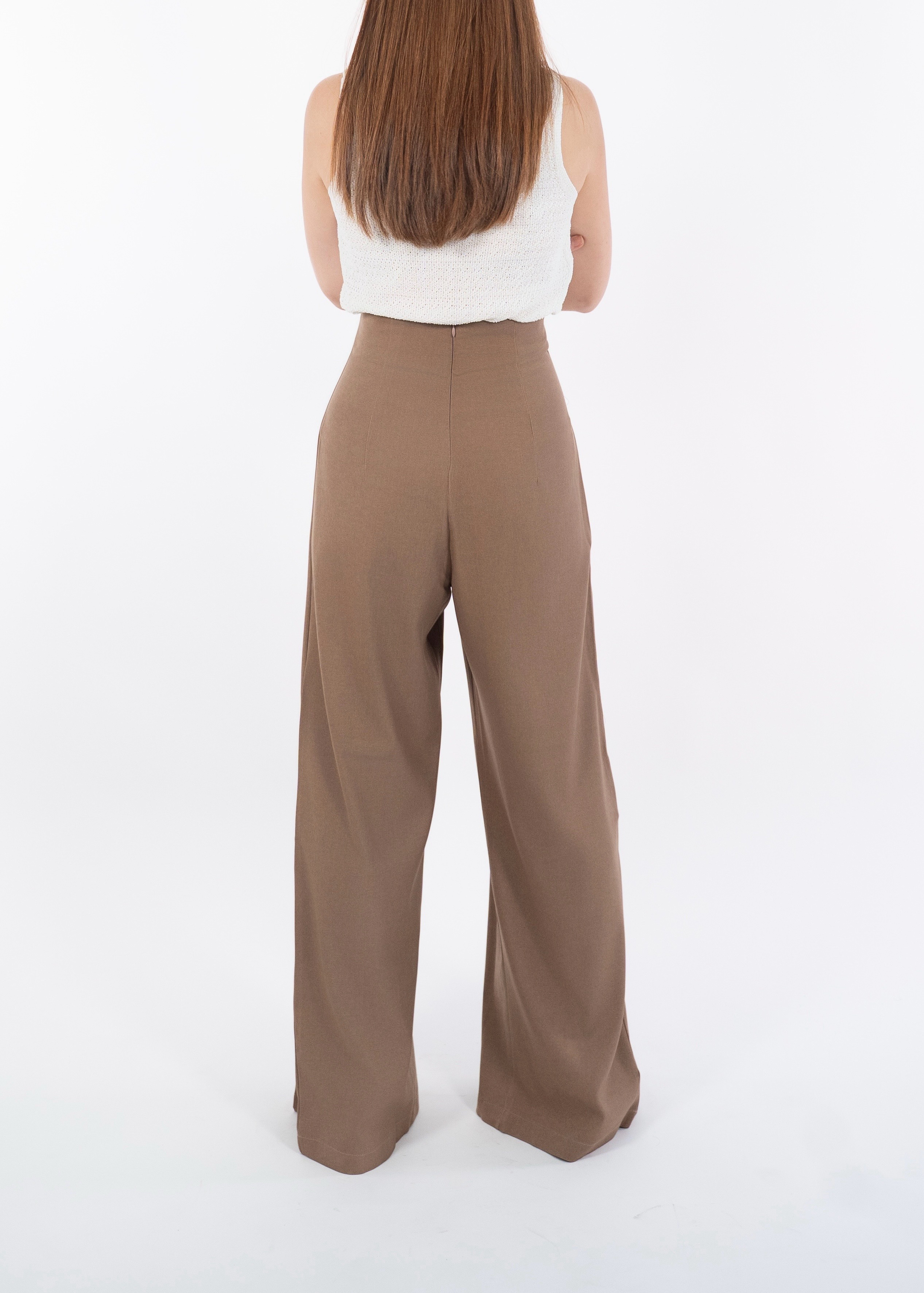 Elevate your wardrobe with these impeccably tailored high-waist pleated trousers, designed to elongate the silhouette with clean vertical pleats and a structured wide-leg flow. The contoured waistband sculpts the waist, while the fluid drape creates a refined, elongated shape that moves gracefully with every step. Perfect for work, events, or elevated everyday styling, these trousers deliver timeless sophistication in every color. ⸻ Fabric & Details • Fabric: Premium blended suiting fabric (breathable, soft structure) • Colors: Black / Mocha Brown • Design: High-waist sculpted waistband • Cut: Wide-leg, long drape, vertical pleats for elongation • Zip placement: Back/side concealed zip • Fit: Structured waist, relaxed leg • Ideal for: Work, dinners, events, styling with fitted tops or blouses